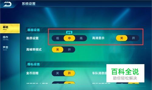 在画质设置里,把画质调整成“低”或“中”,高清显示必然是关的。