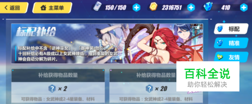 补给分为标配和精准,标配补给可以获得:女武神、圣痕、武器和升级材料;精准补给可以获得:武器、圣痕和升级材料(每期都有不同的获取概率提升的强力武器和圣痕)