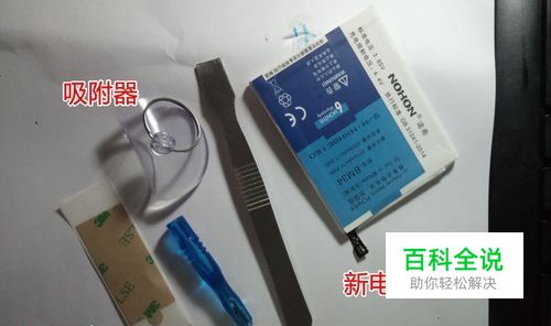 一、准备好工具 工欲善其事必先利其器。首先必须准备,螺丝刀、吸附器、撬刀、新电池、双面胶。至于吹风机,可有可无,两年的机子,用吸附器就可取下后盖,电池出的胶也会松动,徒手即可拆下。