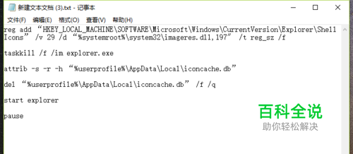 复制下面的文本到文本中并保存 reg add “HKEY_LOCAL_MACHINE\SOFTWARE\Microsoft\Windows\CurrentVersion\Explorer\Shell Icons” /v 29 /d “%systemroot%\system32\imageres.dll,197″ /t reg_sz /f taskkill /f /im explorer.exe attrib -s -r -h “%userprofile%\AppData\Local\iconcache.db” del “%userprofile%\AppData\Local\iconcache.db” /f /q start explorer pause