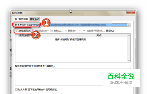 在弹出的“规则和通知”对话框中,可以在“将更改应用与此文件夹”后的选择框中选择需要设置的文件夹,也可以在之后的步骤中确定文件夹;这篇教程主要讲新建规则嘛,所以我们的重点是点击图中标2的选项“新建规则”,然后点击确定。