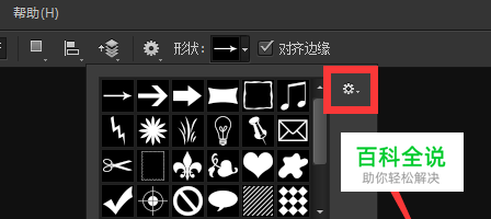 如图,在菜单栏下方的属性栏处,单击下拉箭头即可看到目前PS中所存储的形状工具,点击打开。