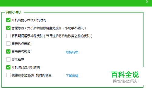 “开机小助手设置”,可以设置开机提示时间,显示天气情况,显示热点新闻以及窗口的皮肤色彩,