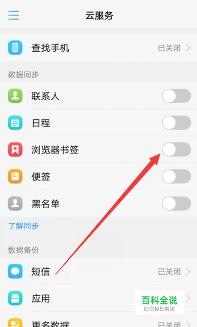 进入之后,打开浏览器书签备份开关,将其进行备份,如图所示。