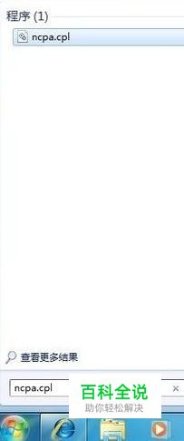 在开始搜索框输入“ncpa.cpl”命令并在程序列表单击ncpa.cpl,打开网络连接窗口