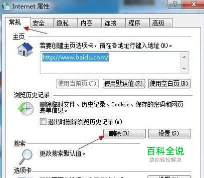 弹出Internet选项对话框,在常规中点击“删除”,如图所示