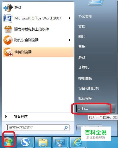 首先,我们点击开始菜单,点击“运行”。