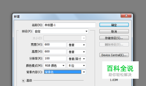 首先启动Photoshop cs5,执行文件-新建命令,新建一个大小为600*600,背景内容为黑色,分辨率为100的文档。