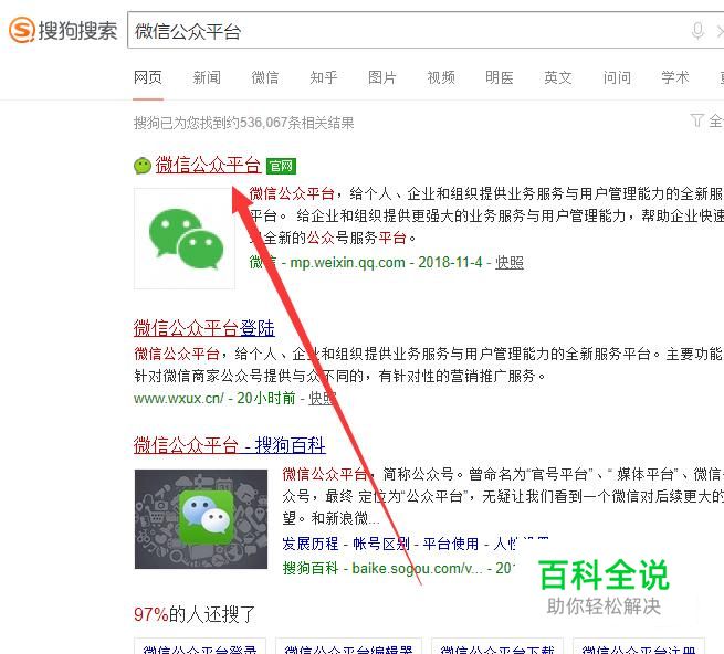 进入之后,搜索“微信公众平台”,点击并进入,如图所示。