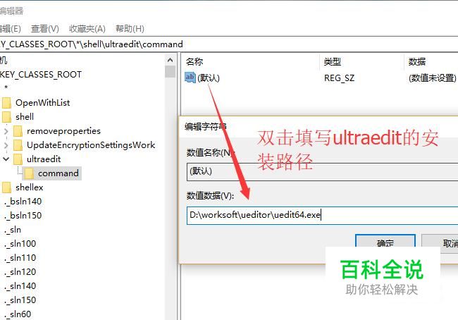 然后选中UltraEdit文件夹,也双击右侧的内容,在数据数值中填入UltraEdit,如下图所示