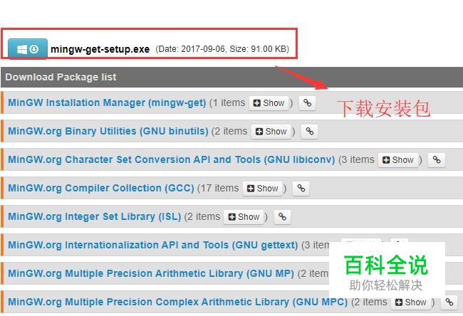 首先我们需要登MinGW的官方平台,进入下载列表,找到Windows下的MinGW安装包进行下载,如下图所示