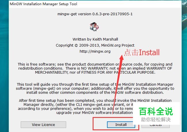 接下来点击下载好的MinGW安装包进入安装向导,点击底部的Install按钮,如下图所示