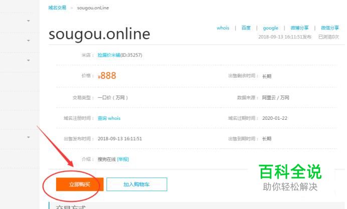 立即购买 在购买网页中,点击【立即购买】按钮就可以购买该域名了,如下图所示: