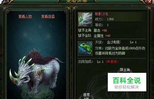主角加成 攻击效果 全队属性加成 阵型加成 射影沙龙 暴击 全外攻降防御 48 速度、命中 金刚魔猿 暴击 全外攻 50 闪避、暴击 万年火龟 生命 单外攻眩晕1回合 46 外防、生命 幽冥玄蛇 生命 全外攻降速度 46 外攻、暴击 东海夔牛 生命 全外攻 52 外攻、暴击 金翅天鹏 速度 单攻无视防御 48 速度、闪避 苔丝曲蛇 速度 全内攻固定回3000血 46 内攻、闪避 九尾灵狐 速度 单内攻后排眩晕 50 生命、闪避 灵鹤玄玉 内攻 全内攻 50 生命、速度 赤炎金猊 内攻 全内攻 52 生命、命中 玄羽神雕 外攻 全攻无视防御 48 速度、外防 烈火麒麟 外攻 全外攻 52 暴击、外防 莽牯朱蛤 韧性 全内攻 46 生命、韧性 天山雪人 外防 全外攻降真气 50 暴击、外攻 玉角龙蜥 闪避 全内攻降防御 52 内攻、命中