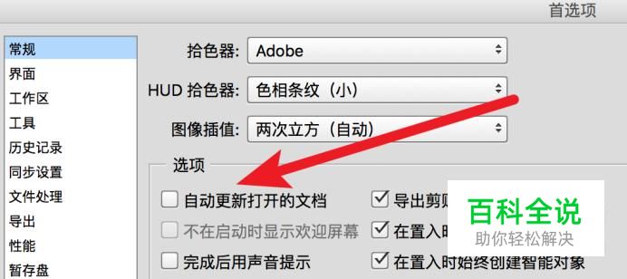 打开首选项窗口后,在常规面板上,点击去掉勾选项‘自动更新打开的文档’就行了。