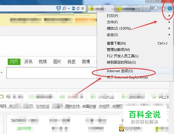 Internet选项 在弹出的下拉菜单中选择【internet选项】,如下图所示: