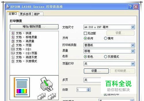 第一种是:依次点击“开始”——“打印机和传真”,在打开的窗口中,右击爱普生L4168打印机,弹出菜单中选择“打印首选项……”即可。