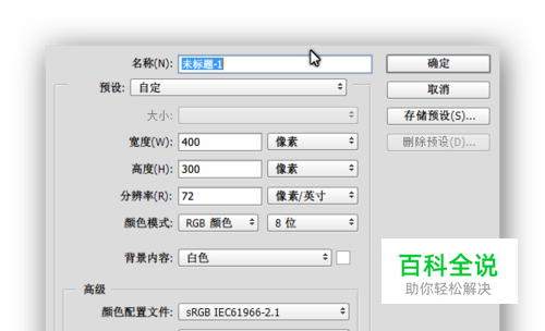 打开ps软件,新建一个400*300像素的文档,分辨率是72就可以。