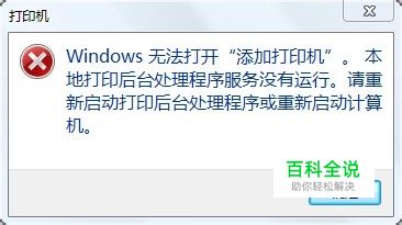 在win7系统下添加打印机的时候会弹出一个对话窗口,显示“Windows 无法打开“添加打印机”。本地打印后台处理程序服务没有运行。请重新启动打印后台处理程序或重新启动计算机”,如下图,结果就是添加本地打印机失败了。这种情况下,重新启动电脑、计算机是没有用的,问题的重点就是本地打印后台处理程序服务没有运行,就是Print Spooler服务没有启动,那么该怎么样启动Print Spooler服务呢?其实,添加打印机的页面如下,已经代表没有启动打印后台处理服务。