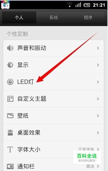 解锁进入主页面后,点击手机左键。进入系统设置个人设置中,点击LED.