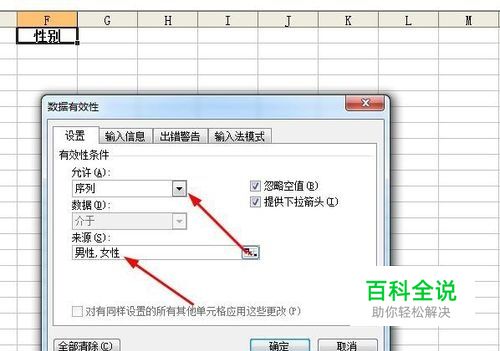 对数据有效性话框中“允许”中选择“序列,在“来源”中依次输入需要设置的下拉框值,以英文逗号间隔