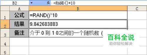 生成特定范围内的随机数,假设给定数字范围最小是A,最大是B,公式是: =A+RAND()*(B-A)。 举例来说,要生成0到10的随机数字,则公式为:=0+RAND()*(10-0),即: =RAND()*10 要生成50到100的随机数字,则公式为:=50+RAND()*(100-50),即: =50+RAND()*(50)