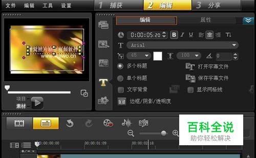 在标题轨或预览窗口的文字对象上连按两下,可以编辑文字内容,以及利用「选项面板」-「编辑」来修改文字的字体、样式、大小、颜色等,还可以设定标题出现的「时间长度」。