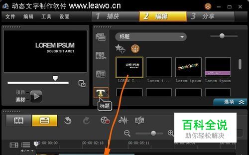 打开软件,添加视频到视频轨。打开「编辑」-「标题」项,展开标题素材库,挑选其中想套用的动画标题模板,将它拖拽至标题轨上。如下图。