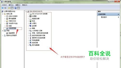 驱动安装之后,需要检查是否有驱动没有安装成功或者缺少安装。在桌面点击计算机图标----鼠标右键【管理】---选择【设备管理器】查看右侧每一项是否有感叹号或者问号,如果有的话,代表驱动没有安装成功,需要进行重新安装。