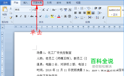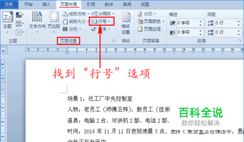 打开Word文档,我们点击主菜单栏中的“页面布局”,然后在其子项“页面设置”组中找到“行号”选项。如图所示: