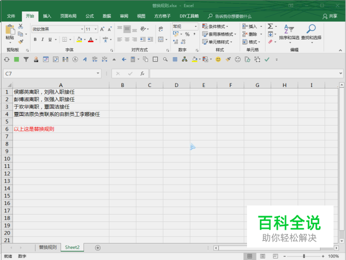 首先我们看下数据和问题,前两条是离职入职的交接,整理出人员姓名即可,后面两条有一个是工作内容调整,并没有离职,如果还是按照问题中的数据去替换,操作就变成了把所有的于欢华替换成覃国洁,然后又把所有的覃国洁替换成了李娜,结果就是于欢华和覃国洁的都变成了李娜,这一点需要注意, 替换时执行的替换规则是从上到下的。