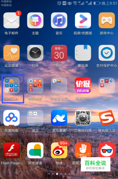 首先,我们打开我们的华为Mate9,然后我们点击实用工具;