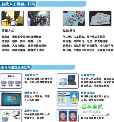 首先按开照片槽,将照片放入照片槽,将照片槽推入机内,点击采集图片,采集完成。只需通过这样的“傻瓜式”操作,一键即可采集照片。同时,它还可根据人脸识别自动按要求裁剪,可对颜色自动判断修复,并可及时对采集的电子照片进行数据存盘,方便上报,加快发卡速度。与传统照片信息采集方式相比,更专业、简单、快捷、易用。