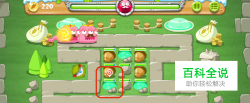 如图所示放炮塔。红色框里放一排回旋镖,右边电塔打右上角的大钱袋。