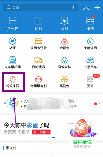 手下打开你的支付宝,点击蚂蚁庄园进入,如下图所示