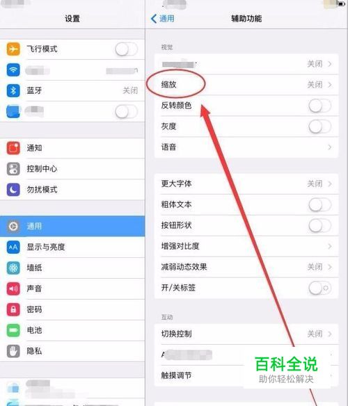 点击缩放按钮的开关,将其关闭,就可以让ipad屏幕变大还原了。