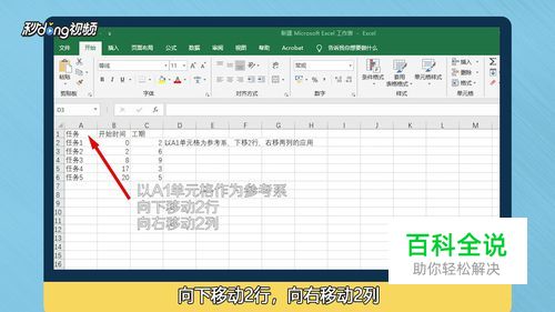 在D3单元格输入公式=OFFSET(A1,2,2,1,1),其中A1是参考系,分别表示下、右移动的行数和列数,同样向上、左则是负数,最后面的1,1表示引用的区域大小是一行一列,也就是一个单元格。