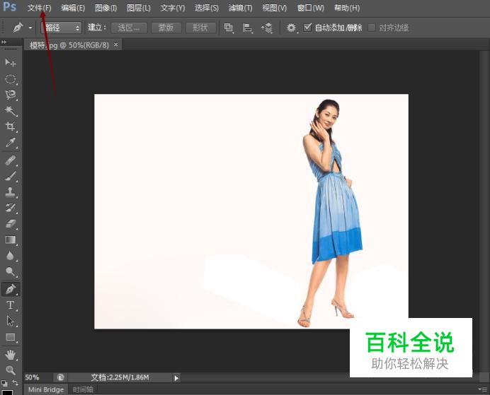 首先打开Photoshop,点击菜单栏中的“文件”,选择“打开”选项,或者按“ctrl+o”,打开模特素材。