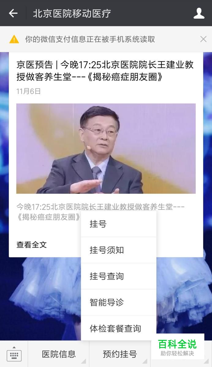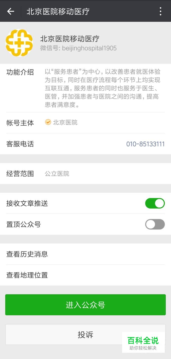 首先,我们打开微信,搜索并关注北京医院移动医疗,点击进入下方的进入公众号按钮。
