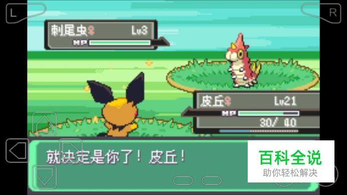 到达皮丘面前先存个档,因为皮丘其实是很弱小的精灵,很容易被我们失手打死。准备好之后跟皮丘点一下确定就会进入到战斗。