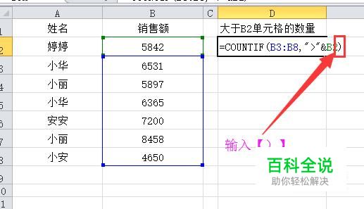 在“大于B2单元格的数量”下面的单元格中输入【=COUNTIF(】
