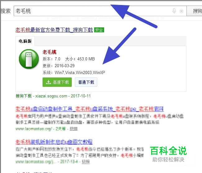 首先我们打开浏览器,用搜狗搜索,来搜索老毛桃,点击下载老毛桃!