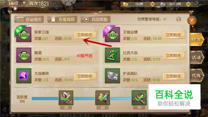 进入活动界面后,在列表中点击“保家卫国”立即前往,每日可参与1次,完成后获得20点活跃度。