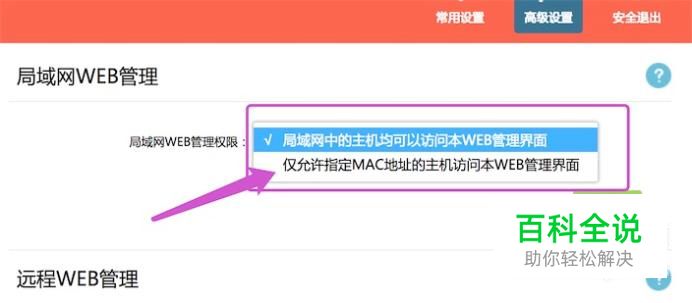打开后,点击“局域网WEB管理”下的下拉框,选中第二项,即‘仅允许指定MAC地址的主机访问本WEB管理界面’。