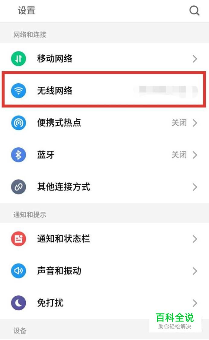 进入设置界面后,找到无线网络并进入(如图所示)。