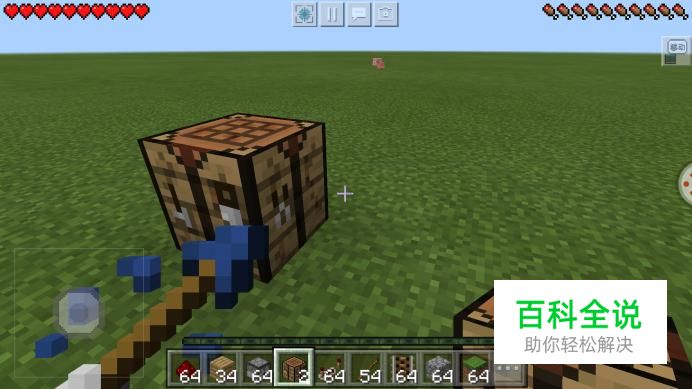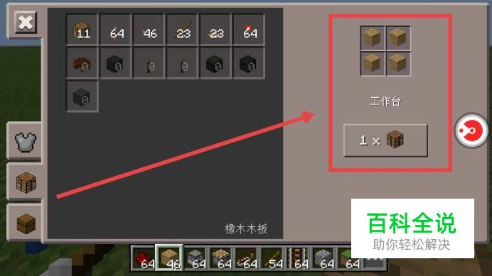 采集好橡木后,我们可以按照步骤一图片中的方式合成工作台,合成后,我们可以把工作台放到物品栏里,再把工作台放到土地上。然后我们就可以使用工作台了。