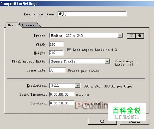 步骤1启动After effects 6.5,打开“Composition/New Composition”菜单选项,新建一个合成文件,命名为“篝火”,大小为320×240,长度为10:00秒,如图2所示。 图2