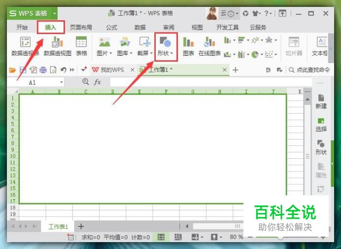 进入表格主界面后,在上方菜单栏中选择“插入”选项,然后在其子菜单栏中选择“形状”选项,如图所示: