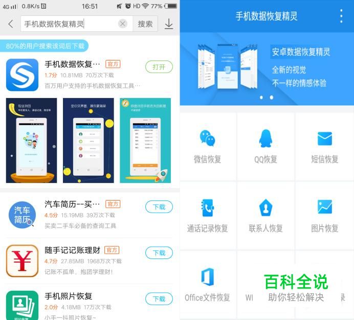打开手机应用商店,输入手机数据恢复精灵,把它下载到需要恢复联系人和短信的手机里