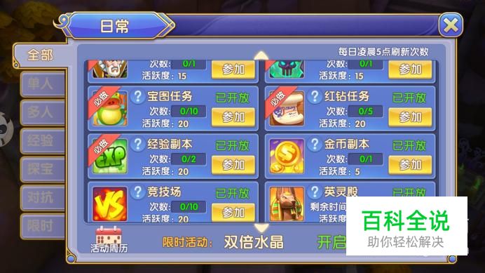 进入日常活动界面,在列表中点击“金币副本”,每日可参加1次,完成后获得5点活跃度。